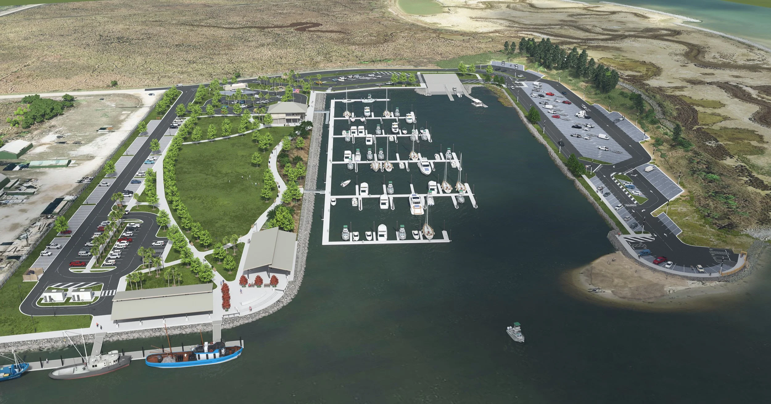 Among these are improved and expanded boat slips, a multi-purpose pavilion for market days and public events, green spaces to provide play areas and serve as sanctuaries for crucial wildlife, a kayak launch complete with living shoreline and interpretive signage, and upgraded public amenities like restrooms, parking lots, and communal spaces.