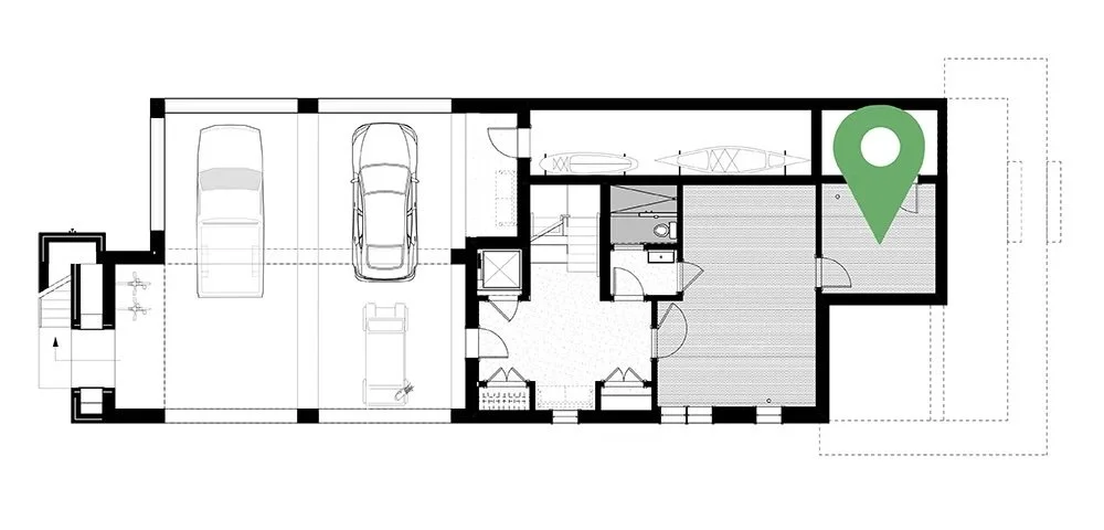 In the Flex Studio and Utility Room, the structural concrete slab has been polished and sealed as a finished floor. This helps to conserve materials by eliminating the need for an additional floor finish. Unlike most concrete buildings in our area, these concrete walls are insulated on the exterior only. On the interior they are simply covered in drywall. This allows their significant mass to serve as a thermal “sink” holding heat in reserve and slowly releasing it, and moderating the temperature of the ground floor.